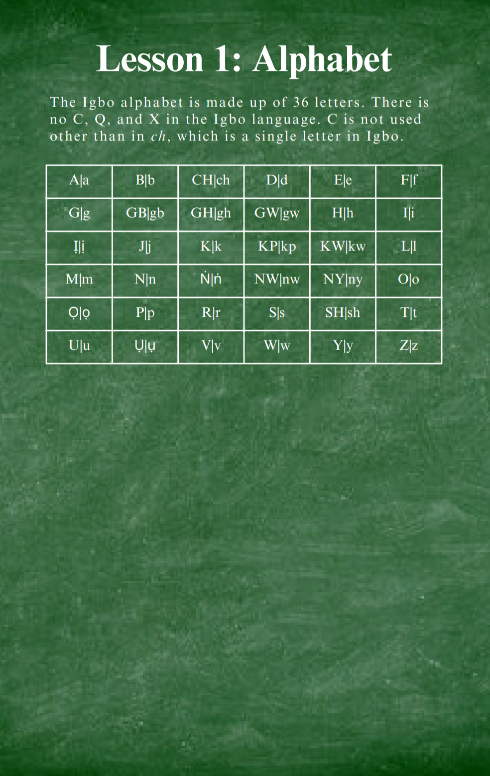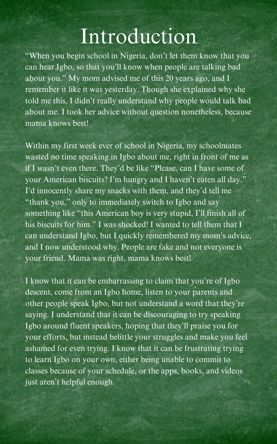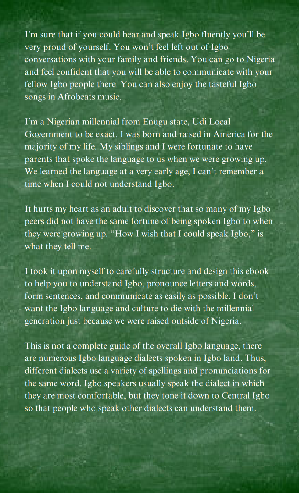 This ebook was carefully structured and designed by Udo Ebulu, a second-generation Nigerian, to teach you how to pronounce letters & words, form complete sentences, and enjoy conversations with your family and friends. It features lessons on the Igbo alphabet, numbers, nouns, verbs, and more. It can easily be accessible to your computer, phone, or tablet.