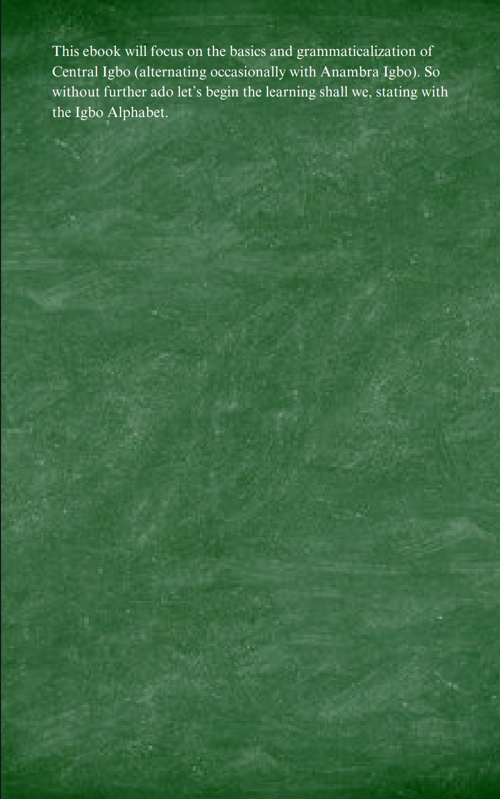 This ebook will focus on the basics and grammar of Central Igbo, such as the alphabet, numbers, nouns, verbs, and more. You will learn how to pronounce letters & words and form complete sentences. Thus, engage in captivating conversations with family and friends.